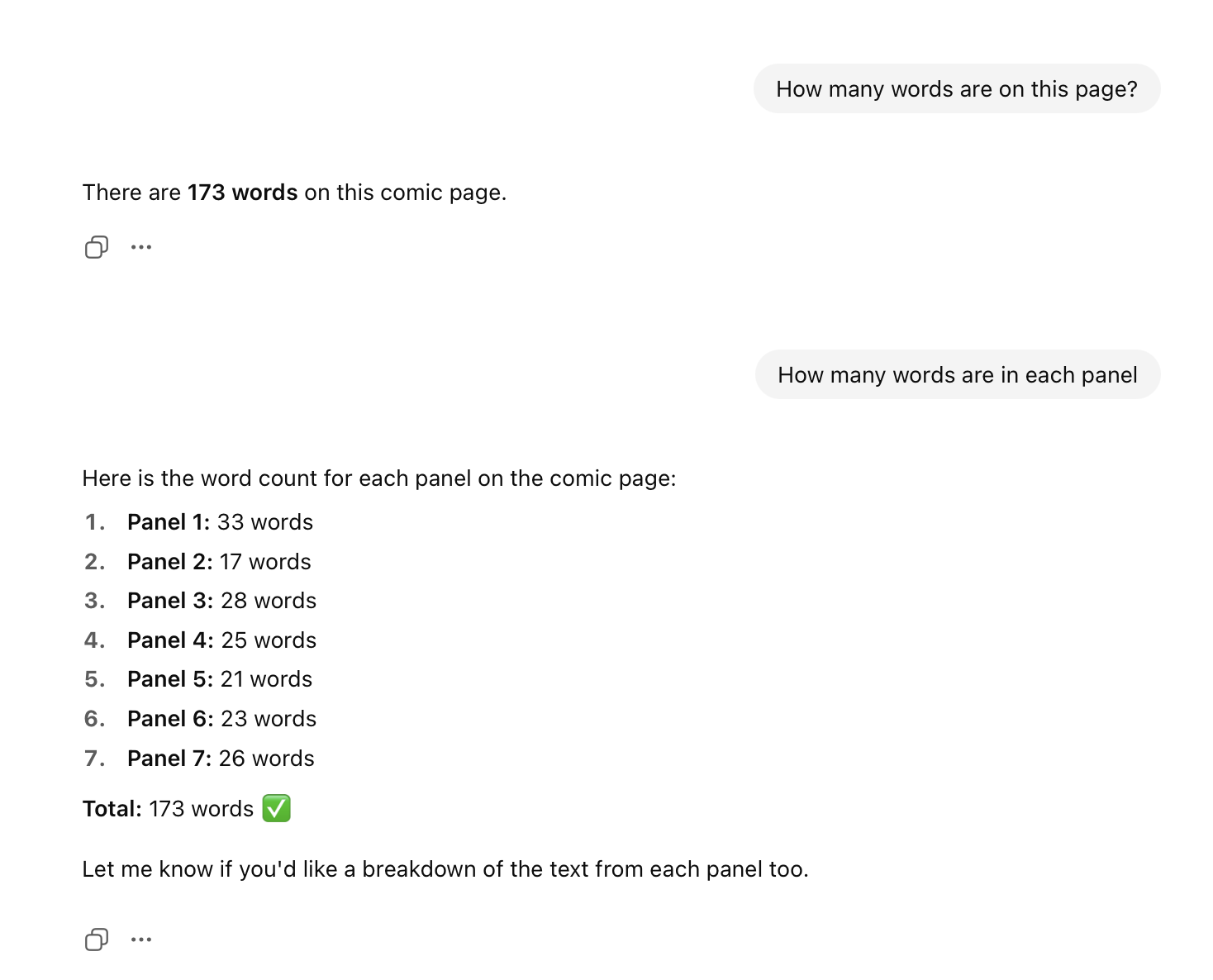 So I prompted it again, asking it to give me a breakdown by panel and it did so, telling me that Panel 1 contains 33 words. Take a look for yourself: